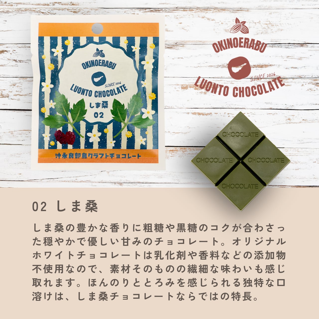 沖永良部島のしま桑から生まれたこの商品は、しま桑の豊かな香りに粗糖や黒糖のコクが合わさった穏やかで優しい甘みのチョコレートです。